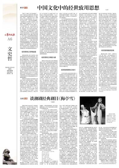 “经世”与“致用”合为“经世致用”一词并广为使用是在晚明时期,然其思想内核或者说精神旨趣却由来已久,源远流长。“经世”一词最早见于《庄子·齐物论》篇,其中讲到“春秋经世,先王之志,圣人议而不辩”。成玄英对此疏解道:“夫祖述轩顼,宪章尧舜,记录时代,以为典谟,轨辙苍生,流传人世。”对于“经”字的本义,《说文解字注》中段玉裁注曰:“织之纵丝谓之‘经’,必先有经而后有纬,是故三纲五常六艺谓之天地之常经。”也就是说,“经”字的本义即是经线,而由于经线处于中枢的关键地位,后来又逐渐引申出大纲、纲领的含义,它的作用是导引秩序和法则。综合成玄英的疏解和段玉裁的文字训诂,我们大体可以推出,所谓“经世”主要是指建构和塑造政治、社会、道德伦理等各方面的章法和秩序的实践活动。经世致用思想是传统儒学的核心思想之一,一方面,它既关注精神境界和价值追求的“道”的层面;同时,它也更加强调制度建设、方针政策等具体的治理之“术”层面的关怀。经世致用思想中所包含的重实用、重实践的理念、家国天下情怀和入世担当的精神在今天依然难能可贵,具有高度的现实指导意义。