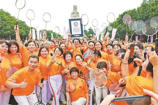 由南沙羽协专业团队创编的羽毛球操充分融入湾区体育文化和羽毛球运动特色,以《击出关键》《一起向未来》作为主题配乐,集技术动作、体能锻炼与团队协作为一体,自推广以来便广受运动爱好者欢迎。主会场中,广州携手湾区各城市组成2000人挑战方阵,同时与北京、上海、香港等13个分会场实时连线,线上线下共同完成这场万人羽毛球操展演,场面热烈、气势磅礴。吉尼斯世界纪录官方代表现场认证,本次活动成功创造“最多人同时表演羽毛球操”的全新纪录。