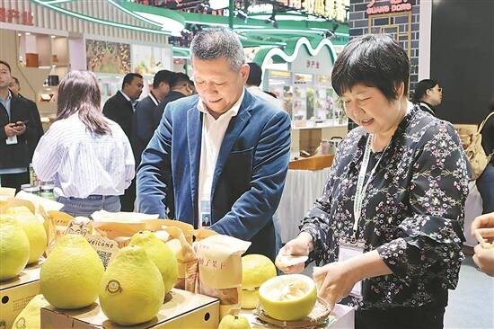 肇庆市粤鼎农林有限公司则展出德庆贡柑、汶朗蜜柚等“土特产”,以鲜艳色泽与清新香气,带来视觉、嗅觉与味觉的多重享受,现场吸引多位消费者和客商加微信下单购买。