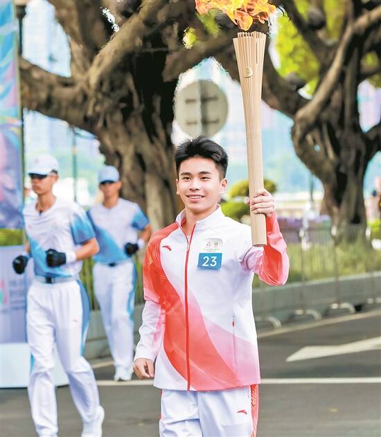 “掌心传递的不只是火炬,更是榜样的力量,这让我真切感受到少年奔赴未来的意义。”完成火炬传递后,钟炜锋声音里带着未平复的激动。从广州市花都区邝维煜纪念中学学生,到打破世界纪录的赛场猛将,再到十五运会广州站最年轻火炬手,他在青春赛道上跳出了精彩,而精彩背后,是师徒传承的温暖力量,是火炬精神的深远影响。