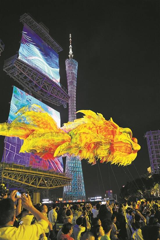 今年是广州国际灯光节第13次举办,同时也是首次与全运会相遇,随处可见的全运元素成为最大亮点。亮灯仪式上,十五运会吉祥物“喜洋洋”“乐融融”萌翻全场,十五运会开幕式“出圈”的巨型鳌鱼也绕场巡游,吸引众多市民驻足拍照。