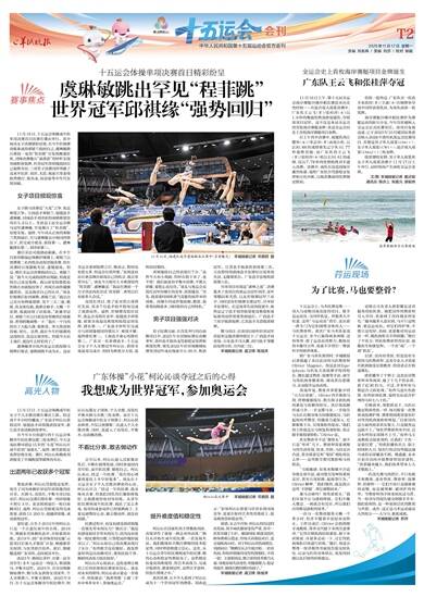 11月16日,十五运会体操成年组单项决赛首日比赛在肇庆举行。其中两项女子决赛堪称惊艳,在今年世锦赛功败垂成的邓娅兰找回自己,虞琳敏跳出难得一见的“程菲跳”引发体操迷狂欢,团体决赛做出“崩溃套”的钟圻实现突破斩获银牌,世界冠军邱祺缘找回自己强势夺冠;三项男子决赛同样奉献了高水平比拼,刘洋、尤浩、杨家兴等老将依然能打,陈治龙、陆崇灿等中生代实现突破。