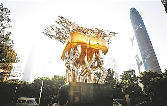 在古希腊时期,只有伟大的文化和艺术家才能创造公共艺术。因为它是文化特征传播中最重要的元素,艺术的公共性在于其传播性和渗透力。在珠江新城西塔外,我有一座大型雕塑金色的“未来之门”作品,由一只巨大的蝉、飘带及小孩们组成。金蝉在发音上接近“金融”;蝉的鸣叫是非常准时的,寓意“信用”;小孩捕蝉,既是许多人的童年回忆,能引发民间共鸣,攀爬也寓意着一种“冒险”精神。即使完全不懂背后深意,单纯看这种灵动的造型,也让人兴味盎然。