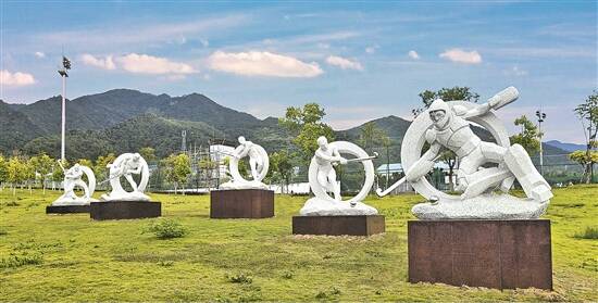 在云浮市曲棍球场外,一组以《石乡曲韵》为主题的曲棍球石雕引人瞩目。