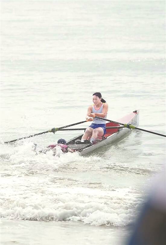 当天上午,海陵岛上金色的沙滩与碧海蓝天交相辉映,来自全国各地的运动员全力向男子单人双桨项目、女子单人双桨项目两枚金牌发起冲击,在沙滩与海浪间展开一场场激烈的角逐。随着发令声响起,运动员们从沙滩起点奋力冲刺,踏沙入水,挥桨破浪,完成“沙滩奔跑+海上竞速+冲滩决胜”的全流程竞技。海岸赛艇这项新兴项目独特的竞技魅力,引得现场观众阵阵欢呼。