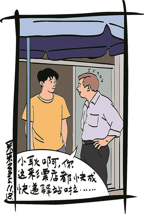 耿鹏经营的彩票店,坐落在一个充满烟火气的大型社区中心位置。随着快递业务的日益繁忙,彩票店又悄然多了一个特殊“功能”——不少住户因工作繁忙或其他不便,总是拜托快递员将包裹临时寄放在彩票店门口。