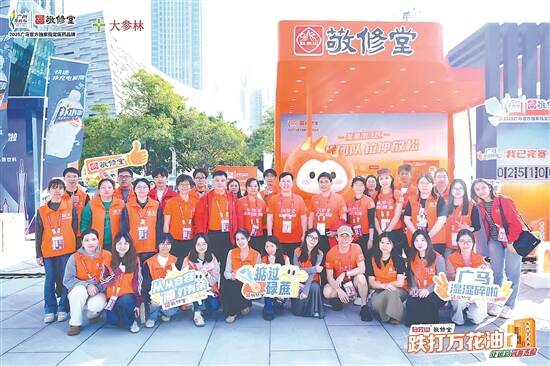 赛道之外,敬修堂的暖心服务同样无处不在。为给跑友注入持续的动力,白云山敬修堂精心组织了“最敬啦啦队”。赛道沿线,4个关键站点的“最敬啦啦队”火力全开,“敬修堂跌打万花油为你加油”“加油,你最敬”的嘹亮口号与热情呐喊,成为跑友前行路上的“精神加油站”。