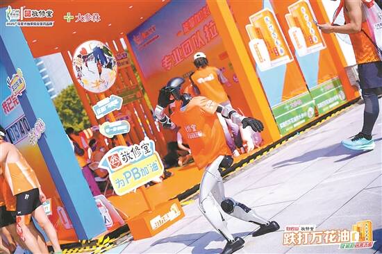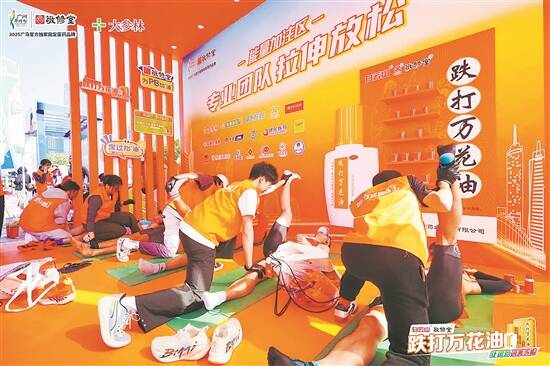 在赛后服务区,一场全方位的“健康守护”更是让跑友倍感温暖。专业理疗师们手持敬修堂经典产品跌打万花油,为跑友进行针对性拉伸按摩,凭借其消肿散瘀、舒筋活络的功效,有效缓解了肌肉疲劳与紧张;合作方大参林的专业药师,为跑友提供医药咨询、公益检测服务;工作人员则细心为跑友过塑号码牌,将这份赛事记忆永久封存;专属留影区更让跑友们得以记录下完赛的喜悦瞬间,定格与广马、与敬修堂的美好联结;敬修堂还引入人形机器人,与跑友们进行亲密互动。