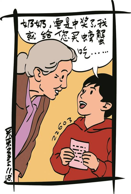 还没等大牛说话,老妈就笑着说:“不管能不能中奖,你就想着能中,心里就有希望,就开心呢!”孙子就说:“奶奶,要是中奖了,我就给你买螃蟹吃。”老妈高兴地把孙子揽在怀里,眉飞色舞地说:“还得是我大孙子,中奖还惦记着我呢!”