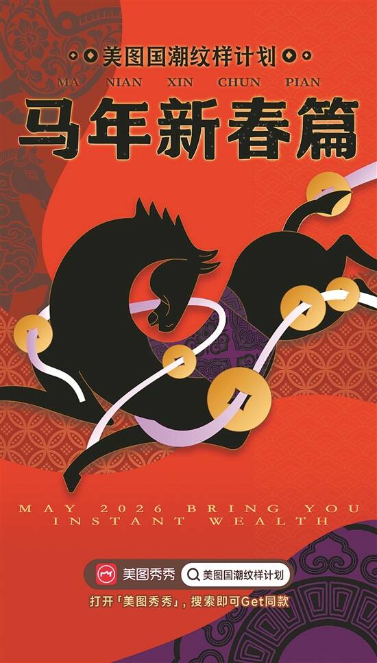 纹样是流淌在中华文明长河中的视觉符号,承载着深厚的历史底蕴与审美智慧。本次马年新春专题,美图秀秀深入挖掘与“马”相关的吉祥文化与纹样体系,对马纹、钱纹、如意纹、回纹等传统纹样进行创新演绎,将新春祝福注入设计之中,使古老纹样成为传递节日情感的创意媒介。