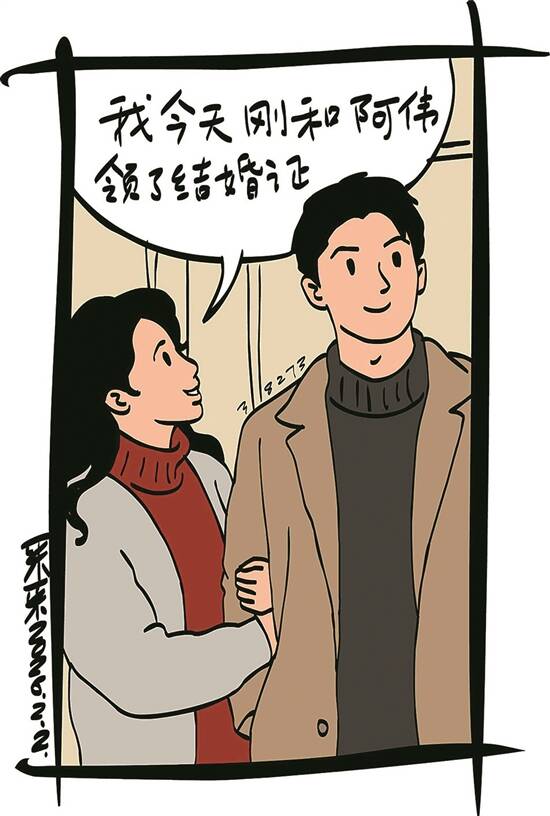 刚进电梯,手中就被塞了一把喜糖,是楼上的邻居小朵。小朵挽着一个帅气的男孩,娇悄地说:“姐,这是我们的喜糖,我今天刚和阿伟领了结婚证。”