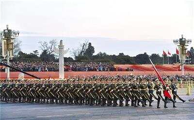 7时32分,升旗号角划破长空,升旗仪式正式开始。96名解放军仪仗队队员组成的护旗编队,从城楼中间券门走上金水桥,30名礼兵肃立两侧迎接国旗。 7时36分,解放军军乐团奏响《义勇军进行曲》,升旗手挥动右臂划出优美弧线,鲜艳的五星红旗迎风展开,与喷薄的朝阳一同升起。