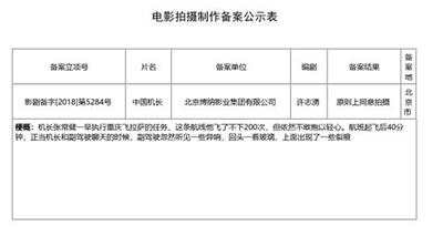 根据备案公示显示,博纳影业申请备案的影片《中国机长》,编剧为许志湧,目前的审核状态为“原则上同意拍摄”。该片根据川航英雄机长刘传健的真实故事改编。剧情梗概为:机长张常健一早执行重庆飞拉萨的任务,这条航线他飞了不下200次,但依然不敢掉以轻心。航班起飞后40分钟,正当机长和副驾驶聊天的时候,副驾驶忽然听见一些异响,回头一看玻璃,上面出现了一些裂痕…… 今年5月14日,四川航空公司3U8633航班从重庆江北机场起飞,到9800米高度成都地区巡航时,机长发现飞机右侧内挡玻璃出现裂纹,立即申请下降高度并返航。机长立即按程序处置,下降高度,减速,戴氧气面罩,凭着过硬飞行技术和良好心理素质,机组成员驾驶飞机安全备降成都双流国际机场,所有乘客平安。34分钟惊心动魄的全手动备降过程,让这段飞行成为中国民航史上一次“史诗级”的飞行。6月8日,机长刘传健被授予“中国民航英雄机长”荣誉称号,该航班机组被授予“中国民航英雄机组”荣誉称号。 (何晶)