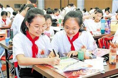 昨日手抄报大赛决赛现场,小选手用画笔描绘“我们这40年” 羊城晚报记者 汤铭明 摄 |