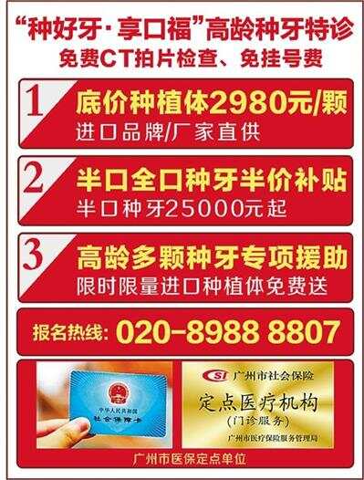牙好身体好!值9月20日国际爱牙日之际,羊城知名公益种牙项目“种好牙·享口福”特开展进社区口腔义诊活动,并同步启动爱牙日专项种牙补助。活动期间,底价进口种植体2980元/颗,现正接受羊城缺牙市民报名申领,半口、全口种牙半价补贴,瑞士ITI种植体每颗直降6000元,报名电话020-89888807。 9·20爱牙日口腔义诊进社区 底价进口种植体2980元/颗申领 值全国第30个爱牙日之际,羊城知名公益种牙工程“种好牙·享口福”主办方启动口腔义诊进社区活动,通过义诊、口腔健康知识宣讲、特惠种牙援助等形式,帮助社区居民进行免费口腔检查和保健等,受到了社区居民尤其是高龄缺牙老人的广泛欢迎。 高龄缺牙老人是口腔问题发生的高频群体,为帮助更多高龄缺牙老人成功种牙,“种好牙·享口福”公益特启动9·20爱牙日专项种牙补助,报名即可享受底价进口种植体2980元/颗、瑞士ITI种植体每颗直降6000元;此外,半口、全口种牙享半价援助,半口种牙补贴后最低仅需25000元。 4大专项种牙技术助力高龄多颗种牙 微创无痛,即拔即种,费用省一半 牙槽骨条件不好、怕疼、身体耐受力差、慢性病多是高龄老人种牙面临的普遍问题。公益项目专项研发的四大种植技术,就是对高龄多颗缺牙老人研发,力求在微创无痛前提下,帮助高龄缺牙老人安全经济种好牙。 即拔即种即刻用:拔牙、种牙一次手术即可完成,免除二次手术,还能降低植骨费用,实现当天种牙当天用。 短植体种植技术:可以规避牙槽骨骨量不足问题,只需少量植骨甚至不植骨也能种,降低高龄种牙门槛。 微创无痛种植:采用美国无痛注射、微小切口或不翻瓣技术,创口小、出血少、恢复快,尤其适合怕疼或耐受力差的长者。 少量植体恢复多颗牙:ALL-ON-N桥式种牙手法,只需4-6颗即可恢复半口牙、8-12颗恢复全口牙,减少创伤的同时大大降低种牙费用。