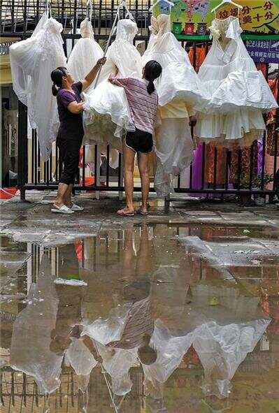 江南大道婚纱街内巷,遭遇水浸的婚纱档口趁着天晴晾晒衣物 宋金峪 摄 |