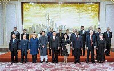 11月4日晚,国家主席习近平和夫人彭丽媛在上海举行宴会,欢迎出席首届进博会的各国贵宾。图为宴会前,习近平和彭丽媛同各国领导人夫妇合影留念 新华社发 |