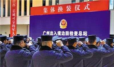 羊城晚报讯 记者黄巍俊、黄丽娜,通讯员徐旭宇、刘昆明、黎海生、张远东摄影报道:永葆听党指挥、忠诚可靠的军人本色,誓做不忘初心、牢记使命的国门卫士。2019年新年第一天,广州出入境边防检查总站组织原广东省公安边防总队300余名转改官兵举行集体换装仪式(上图),正式换着人民警察制服,以全新面貌踏上崭新征程。 “我宣誓:我志愿成为中华人民共和国人民警察……”仪式现场气氛庄严昂扬,在广州出入境边防检查总站负责人陈惠溪的领誓下,300余名身着崭新藏青蓝警服的移民警察,面向警徽,举起右拳,精神抖擞,誓词铿锵,表达了永葆革命军人本色、续写人民卫士荣光的坚定决心和满腔豪情。 据了解,自1949年10月全国首个边防检查口岸在深圳罗湖诞生以来,广东边防部队走过了69年的光辉历程,广大官兵始终坚持守边有责、守边负责、守边尽责,在打击违法犯罪、服务驻地发展、遂行要事安保、应急抢险救灾等重大工作任务中立下了赫赫功勋,共有20个集体、31名官兵被中央军委、国务院、公安部授予荣誉称号,21个集体、82名官兵荣立一等功,18人被追认为革命烈士,历代边防官兵用忠诚、热血和担当,践行全心全意为人民服务的铮铮誓言,有力维护了“一国两制”,确保了南粤国门安全无虞。