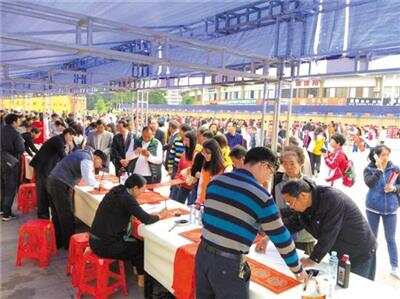 羊城晚报讯 记者袁增伟、湛协宣摄影报道:为弘扬中华民族传统文化,展示书法艺术魅力,营造热烈、祥和的节日气氛,1月20日,湛江市政协牵头主办,组织各县(市、区)政协和湛江市教育局、文联、书法家协会、促进科教文化发展基金会联合举办“挥毫送春联,祝福到万家”活动(如图),邀请全市500多名书法名家当场挥毫,为全市各地群众免费书写春联,将平安、吉祥的祝福送到千家万户。