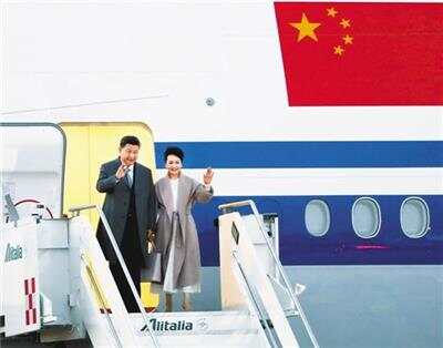 当习近平乘坐的专机进入意大利领空时,2架意大利空军战机升空护航。21日晚6时30分许,专机抵达罗马菲乌米奇诺机场。习近平和夫人彭丽媛步出舱门,礼兵敬礼致意,意大利农业旅游部部长等高级官员在舷梯旁热情迎接。习近平和彭丽媛沿红地毯前行。礼兵肃立在红地毯两侧,行注目礼。 习近平代表中国政府和中国人民,向意大利政府和人民致以诚挚问候和良好祝愿。习近平指出,中意建交49年来,两国关系经受住时间和国际风云变幻的考验,双方秉承互尊互信、互利共赢原则,不断推进中意友好和合作,成为不同社会制度、文化背景、发展阶段国家发展双边关系的典范。中意务实合作硕果累累,为两国人民带来了实实在在的利益;人文交流丰富多彩,增进了彼此了解和友谊。 习近平指出,我期待着同马塔雷拉总统、孔特总理等意大利领导人会谈会见,共同描绘中意关系未来发展蓝图。相信在双方共同努力下,中意全面战略伙伴关系必将拥有更加美好的明天。 习近平主席夫人彭丽媛,中共中央政治局委员、中央书记处书记、中央办公厅主任丁薛祥,中共中央政治局委员、中央外事工作委员会办公室主任杨洁篪,国务委员兼外交部长王毅,全国政协副主席、国家发展和改革委员会主任何立峰等陪同人员同机抵达。