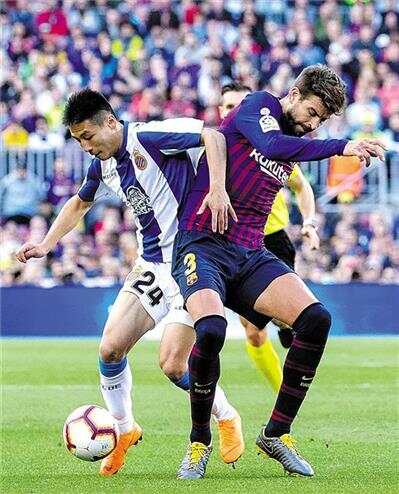 巴塞罗那队球员皮克(右)与西班牙人队球员武磊在比赛中 新华社发 |