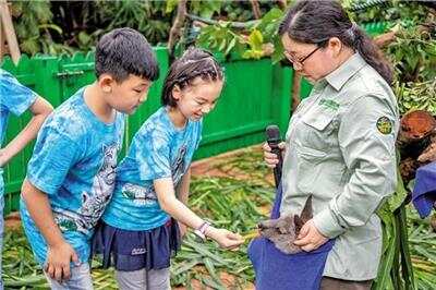 亲子家庭探秘团首先来到该园的“动物幼儿园”,探秘澳大利亚标志性动物——袋鼠。据介绍,东灰袋鼠分布在澳大利亚南部及东部。 为了模拟袋鼠妈妈的育儿袋,该园饲养员巧妙地做了一个袋子把小袋鼠放入,然后背在身上模拟成“人肉”育儿袋,小朋友们也跃跃欲试背上“人肉”育儿袋,体验当“妈妈”的不易。 随后,亲子家庭探秘团探访了澳大利亚国鸟鸸鹋和刚刚出生不久的折衷鹦鹉。据悉,鸸鹋是世界上第二大鸟类,仅次于非洲鸵鸟。鸸鹋蛋由爸爸孵化,在长达60天的孵化时间里鸸鹋爸爸几乎不吃不喝,一心孵蛋,可以说是动物界最伟大的爸爸之一。 长隆野生动物世界繁殖拥有五大洲近500种、超两万只珍稀动物,同时还建立了专门的动物繁育基地和保育幼儿园。今年,该园将大力打造集科普参观、讲解、动物课堂、科普互动等于一体的“动物科普节”,让更多学生和亲子游客深度探索动物的繁育、习性、成长等鲜为人知的奥秘。