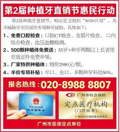 怕痛、种牙多费用大是高龄老人种牙的两大“拦路虎”!据调查显示:55岁以上种牙患者中,超过80%的患者或多或少会担心疼痛,在60-80岁缺牙人群中,半口、全口缺牙者占比高达60%!为了帮助高龄老人顺利种牙,广州某医保定点口腔医院联合7大种植体厂商举办第2届种植牙直销节,厂家特供种植体2980元/颗,半口、全口种牙半价补贴,并成立“高龄种牙名医特诊小组”,开展一对一特诊活动,短短半个月内,已经成功帮助上百名老人顺利种牙,报名电话020-89888807。 》高龄怕痛人群 微创精准种植,种牙后甚至不用吃止痛药 暨博口腔医院潘院长介绍,怕痛是高龄老人种牙常见的一种顾虑,医院目前采用“微创精准”种牙技术,解决了传统种牙技术创伤大、恢复慢的缺点,七八十岁高龄也能轻松种牙。 借助数字化3D影像及种植导板:三维种植导板可视化精准植入,手术时间缩短接近一半。 三甲名医近30年种牙经验:特有微创操作手法,仅3-4毫米微细创口、出血少、愈合快。 引进美国舒适麻醉技术:手术全过程几乎感觉不到疼痛,情绪舒缓轻松。 》半口、全口缺牙人群 少量种植体恢复多颗牙,费用省半 种牙是不是缺1颗种1颗?那缺半口牙,岂不是要种十几颗?不少缺牙患者都存在这样的疑问。传统种牙方式,确实是一个萝卜一个坑,一颗植体一颗牙冠,弊端在于手术创伤大、手术时间长、费用贵。羊城知名种植专家潘广嗣院长介绍,ALL-ON-N种植技术很好地解决了这一难题,通过选择牙槽骨条件好的区域,精准植入种植体,再通过“搭桥连冠”修复技术,实现少数种植体重建多颗牙, 4-6颗植体即可恢复半口牙,8-12颗植体恢复全口牙,手术创伤小,还能省下近一半费用!