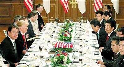 27日,安倍晋三(右四)与特朗普(左二)举行工作午餐 新华社发 |