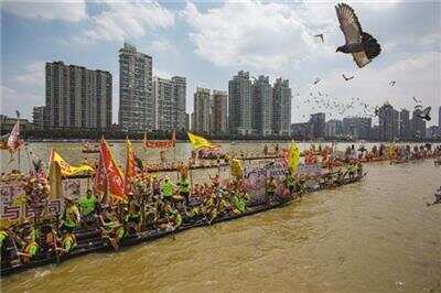 龙舟与广州各建筑物共同构成美丽的风景线 羊城晚报记者 梁喻 摄 |