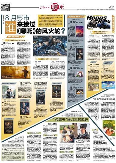 《哪吒之魔童降世》带旺了暑期档市场,这是一件好事。当观众对大银幕产生兴趣,那些真正高质量的作品才有一搏之机。 8月,暑期档来到第二程。主旋律商业片《烈火英雄》已经烧起了本月影市的第一把火,好莱坞动作大片《速度与激情:特别行动》则在后面虎视眈眈,而月底一帮新导演带来的艺术片则可能为华语影坛吹来一股清新的风。 国产商业片梯队 种子《烈火英雄》:真实的力量不可小觑 导演:陈国辉 主演:杜江、黄晓明、谭卓、杨紫、欧豪 上映:8月1日 作为8月影市的第一棒,反映消防员奉献与牺牲的影片《烈火英雄》于8月1日公映。影片改编自真实事件,由一众内地演员出演,来自香港的导演陈国辉则负责将这部主旋律影片拍出商业大片的质感。导演从原型采访阶段开始就被这群“凡人英雄”的故事深深打动,并决定用最朴素真实的手法来还原当年的这场“死里求生”。 为了最大程度地还原消防员的形象,演员在拍摄前便前往消防队进行了一个月的特训,“必修课”从消防设备操作,到拆解工具和指挥战斗,甚至还有高空索降。主演杜江曾在采访中透露:“我记得第一天训练的时候就有很多演员中暑和受伤,在高温下战斗服5分钟就已全部湿透,但没有一个人说过要放弃。” 《战狼》系列和《红海行动》已经证明了主旋律商业大片的票房潜力,《烈火英雄》同样有机会拿到高票房。截至记者截稿时,《烈火英雄》上映三天已获得不错的成绩,平均每日票房均过亿元,“8月国产片第一种子选手”的态势已显现。口碑方面,“英雄亦凡人”的拍摄角度感动了许多观众,例如片中杜江扮演的消防中队长马卫国在大火终于被扑灭后,边啃鸡腿边忍不住为牺牲的兄弟痛哭失声的戏份,被不少观众评为“年度银幕最戳心时刻”。 种子《上海堡垒》:会是下一部《流浪地球》吗 导演:滕华涛 主演:鹿晗、舒淇 上映:8月9日 “森严的铁护壁正从水底缓缓上升,江流激动,水花跳跃。直径四十米的炮口仰对天空,黑色的表面像是升温那样发出暗红色的光……”在江南的原著小说《上海堡垒》中,上海大炮成为人类文明反击外星文明的秘密武器,它埋藏在黄浦江江底,是人类文明与外星母舰决战的一把“利剑”。由滕华涛执导,根据江南同名小说改编的科幻战争电影《上海堡垒》将“上海大炮”搬上了银幕。 片中,“上海大炮”是全球唯一一个有效的进攻型决战武器。因此,滕华涛在前期设计阶段就定下方向:“上海大炮”要有鲜明的中国特色。它从概念设计到最终定稿,耗时超过两年。“中国特色”也是整部影片的核心理念,正如滕华涛所说:“中国科幻不仅是中国制作,还要有中国情怀。” 《上海堡垒》很容易让人联想到今年贺岁档的《流浪地球》。号称开创“中国科幻元年”的《流浪地球》最终创下了46.55亿元的总票房,《上海堡垒》能否做到,就要看其制作的完整度到底如何了。 《使徒行者2:谍影行动》 导演: 文伟鸿 主演: 张家辉、古天乐、吴镇宇 上映:8月7日 2014年的剧集版《使徒行者》曾是TVB的翻身之作,以24亿的播放量成为现象级作品。2016年推出的电影版,再次成为大银幕救市之作,在内地也收获了6亿元票房,被称为继《无间道》系列之后最好的“卧底片”。此次原班人马回归,古天乐、张家辉、吴镇宇三大戏骨联手,就已经是最大的吸睛点了。 《龙牌之谜》 导演: 伊哥·斯坦普陈科 主演: 成龙、阿诺·施瓦辛格 上映:8月16日 这部中影出品的大片突然插进暑期档。故事发生在东方:龙王在睡觉的时候,睫毛长到地里就能长出茶叶,于是他把睫毛交给了成龙扮演的白魔法大师照料……成龙和施瓦辛格早在2004年的电影《环游地球80天》中就有合作,但两人没机会对打,这次可以弥补遗憾了。影片展现中、英、俄三国风貌,想要走国际市场的意图十分明确。 《沉默的证人》 导演: 雷尼·哈林 主演: 张家辉、杨紫、任贤齐 上映:8月16日 或许是为了避开同为杨紫主演的《烈火英雄》,《沉默的证人》由8月初挪后上映。导演来自好莱坞,但影片更似标准的港片风格。有张家辉坐镇,不少观众就已经对影片的质量有了一定信心,连导演雷尼·哈林都说,“渣渣辉”是全片的主心骨。故事发生在狭窄的法医中心内,动作戏不少,情节紧凑又有案中案悬念,商业性不赖。 《保持沉默》 导演:周可 主演:周迅、吴镇宇、祖峰 上映:8月23日 律政女强人端木兰与检控官吴正为因一宗案件在庭审上相遇,并展开了针锋相对的法庭辩论……周迅和吴镇宇不但扮演对手,在戏中还是一对昔日恋人。“周公子”近年大银幕作品不多,难得一部,值得期待。 《深夜食堂》 导演:梁家辉 主演:梁家辉、刘涛 改编自安倍夜郎的同名漫画:一名中年大叔守着不起眼的弄堂小餐馆,每到深夜开张,他都会为每个到访的食客做一份专属食物……梁家辉自导自演,除了主演梁家辉和刘涛,还有邓超、彭于晏、蒋雯丽等人友情出演。 《送我上青云》 国产文艺片梯队 导演: 滕丛丛 主演: 姚晨、袁弘、李九霄、梁冠华 上映:8月16日 《送我上青云》由新人导演滕丛丛自编自导,曾入围第二十二届上海国际电影节“亚洲新人奖”单元最佳影片、最佳导演奖。剧情围绕当代女性生存现状展开,这也是姚晨第一部以监制及主演身份亮相的女性电影。片中,她扮演的女记者在发现自己患上卵巢癌后走上了寻找自我的旅程。 《铤