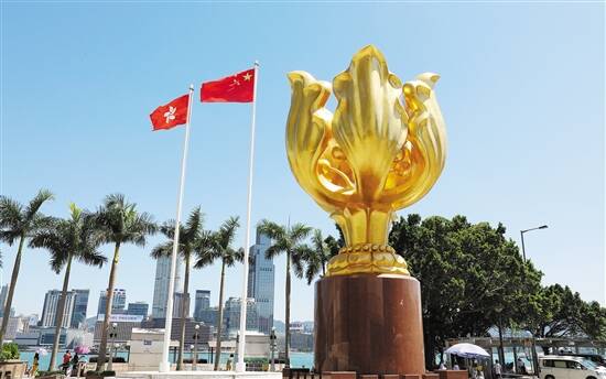 五星红旗在香港金紫荆广场上高高飘扬 新华社发 |