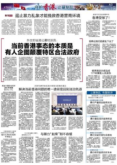 据新华社电 国务院新闻办15日下午在京举办吹风会(见右图 新华社发),请内地专家学者谈对香港当前事态看法。专家们表示,解决当前香港问题的唯一途径是回到法治轨道。
