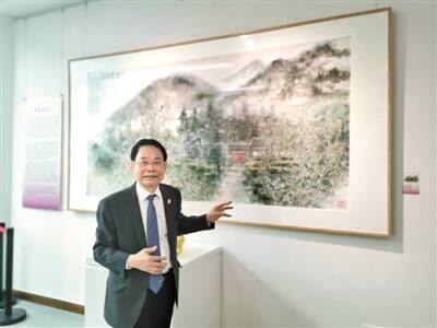 ▲萧晖荣在画作《苟坝晨曦图》前 |