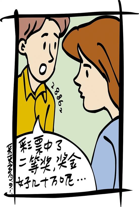 这一次,王浩一直等到投注站关门才回了家,邱岩却不在家。他以为邱岩赌气回了娘家,就泡了泡面边吃边看电视。电视正直播彩票开奖,结果锁定后,王浩大叫一声:“天啊!我中二等奖了!” 王浩想把这好消息第一时间告诉邱岩,没想到,打通邱岩电话后还没开口,邱岩就说:“离婚吧”。邱岩离家后的第三天,岳父主动打电话叫他过来,一进门,岳父拉着他的手说,邱岩找到了。原来,那天邱岩发完火后就感觉身体很不舒,去医院一查,是乳腺癌。邱岩冷静了,想到王浩平日对她的好和忍受着她无缘无故的发脾气,她不想拖累王浩,不想看到王浩到处借钱给她治病,所以就提出要和王浩离婚。 听完岳父的话,王浩扭头直奔医院,跟医生沟通之后,王浩跑到病房拉着邱岩的手说:“我问医生了,你这病是早期,能治好,我有钱,彩票中了二等奖,奖金好几十万呢!” (杨进峰)