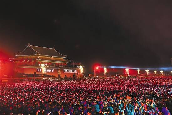 金秋时节的北京,张灯结彩,繁花似锦,处处洋溢着节日的喜庆气氛。从天安门广场到金水桥南端,大型“红飘带”主题景观、7棵特效光影“烟花树”、LED巨幅网幕、3000多名手持“光影屏”的联欢群众以及各族各界群众,将联欢活动核心区域装扮得流光溢彩、绚丽夺目。10个群众联欢区分布长安街沿线,数万群众以欢歌热舞,点赞共和国、讴歌新时代。 19时57分,习近平等领导同志来到天安门城楼主席台,向现场群众挥手致意。全场发出热烈的欢呼。 20时整,电报大楼传来悠扬的《东方红》乐曲,中共中央政治局委员、北京市委书记蔡奇宣布联欢活动开始。东自建国门、西自复兴门,70束烟花柱依次腾空而起,向天安门广场汇集。广场上空,“70”字样的烟花,表达全国各族人民对新中国70华诞的热情礼赞。 联欢活动分4个篇章,由主题表演、中心联欢表演、群众联欢和烟花表演组成。 序章“红旗颂”,拉开了联欢活动的序幕。在庄严的礼炮声和雄浑的交响乐曲声中,3000多名表演者汇聚在一起,构成了巨幅五星红旗图案。蓝天白云下、雪山之巅,解放军战士护卫着国旗;万顷碧波中、岛礁之上,少年儿童向国旗致敬;浩瀚星空中、“神舟”飞船上,国旗图案跃然于画面……在《歌唱祖国》的歌声中,一面长90米、宽60米的巨幅国旗在广场上空冉冉升起。五星红旗,你是我的骄傲;五星红旗,我为你自豪。当3000多名表演者手持烟花组成“祖国万岁”字样时,各族群众涌向天安门广场中心,全场沸腾,同声欢呼“祖国万岁”。 第一篇章“我们走在大路上”,唱响新中国70年的奋斗之歌,展现站起来的中国人民的精神风貌。鼓声激昂,劲舞欢腾,一条条红色花带编织成一个巨大的中国结,人们以最热烈的方式表达爱党爱国的心声。蒙古族的《赞歌》、藏族的《唱支山歌给党听》《北京的金山上》、维吾尔族的《青春舞曲》、朝鲜族的《红太阳照边疆》、壮族的《只有山歌敬亲人》、回族的《花儿与少年》……各族群众载歌载舞、同欢同乐。《青年友谊圆舞曲》的旋律声中,广场的夜空火树银花、璀璨绚烂。从风雪群山到大漠深处,从广袤原野到蔚蓝海洋,人民共和国的一支支建设大军奔向祖国最需要的地方。 第二篇章“在希望的田野上”,象征改革开放如春风化雨滋润着神州大地。从上世纪50年代的《我的祖国》、60年代的《花儿朵朵向太阳》、70年代的《中国,中国,鲜红的太阳永不落》……到新世纪的《阳光路上》,伴着一首首新中国成立后各个时期的经典歌曲,联欢群众载歌载舞,尽情展示民间文化和民俗艺术。伴随着《北京喜讯到边寨》的旋律,烟花腾空而起、流光溢彩。在希望的田野上,我们用双手创造着美丽的家园。轻风中的云朵化作春雨,洒落在沃野,象征着希望的幼苗破土而出、开枝散叶,长成参天大树,结出累累果实。“烟花树”上呈现出充满童心童趣的“幸福家园”动态图案。 第三篇章“领航新时代”,展现出新时代中国人民多彩的梦想,彰显着各族人民为实现中华民族伟大复兴追风逐梦的精神风貌。彩色的风车、旋转的光轮,激情的舞动、活力的奔跑,新天新地新时代的幸福图景中,联欢群众同歌共舞。音乐烟花《新时代圆舞曲》,以一幅幅恢弘画面演绎着新时代的豪迈与荣耀。花蕊绽放出中国梦的美好愿景,花瓣洋溢着新时代的蓬勃生机,缤纷的花瓣翩然漫舞,化身为羽羽白鸽。沿着鸽群翱翔的轨迹,出现了地球形状的同心圆,一条条经纬线纵横穿梭,定格在“一带一路”会标图形上。同心圆变成一张巨大的笑脸,随后化作3000多张笑脸,组成“新时代”巨幅图案。表演者点燃手中烟花,将“新时代”字样装点得璀璨亮丽。“烟花树”上呈现出象征富足兴旺、如意吉祥的“牡丹盛放”动态图案。联欢群众涌入这美好图景之中,用发自内心的歌声汇聚成一曲《不忘初心》的心灵交响。各族同胞、各界群众以快闪的形式,在《我和我的祖国》的歌声中表达对祖国的爱,憧憬更加美好的未来。伴着《同欢同乐同祝愿》的歌声,人们欢歌热舞,共庆新中国华诞。 “五星红旗迎风飘扬,胜利歌声多么响亮……” 今晚,千歌万曲汇成一种表达——歌唱祖国;今晚,千山万水回荡一个声音——人民万岁。 习近平等领导同志同全场群众一起高唱《歌唱祖国》。“烟花树”上呈现出一幅寓意“欣欣向荣”的孔雀图案,天安门广场上空万花绽放。此刻,联欢活动的气氛达到最高潮。 21时30分许,联欢活动圆满结束。广场上,激动不已的人们仍沉浸在欢乐和兴奋之中,久久不愿离去…… 出席联欢活动的还有:丁薛祥、王晨、刘鹤、许其亮、孙春兰、李希、李强、李鸿忠、杨洁篪、杨晓渡、张又侠、陈希、陈全国、陈敏尔、胡春华、郭声琨、黄坤明、李瑞环、贾庆林、张德江、俞正声、宋平、曾庆红、吴官正、李长春、贺国强、刘云山、张高丽、尤权、曹建明、张春贤、沈跃跃、吉炳轩、艾力更·依明巴海、陈竺、王东明、白玛赤林、丁仲礼、郝明金、蔡达峰、武维华、魏凤和、王勇、王毅、肖捷、赵克志、周强、张军、张庆黎、刘奇葆、万钢、何厚铧、卢展工、王正伟、马飚、陈晓光、梁振英、夏宝龙、杨传堂、李斌、巴特尔、汪永清、何立峰、苏辉、郑建邦、辜胜阻、刘新成、何维、邵鸿、高云龙和姜春云、王乐泉、王兆国、回良玉、刘淇、王刚、刘延东、李源潮、马凯、李
