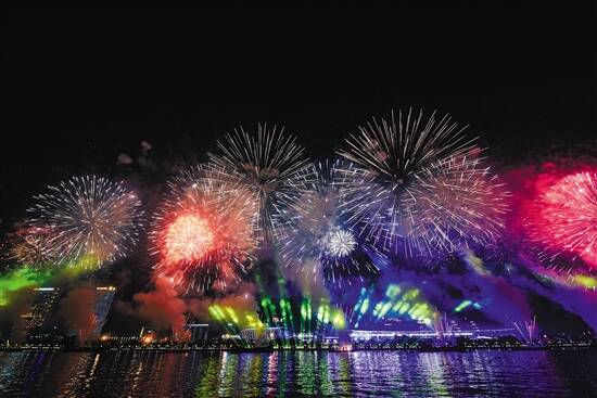 美丽焰火与城市背景交相辉映 羊城晚报记者 宋金峪 摄 |
