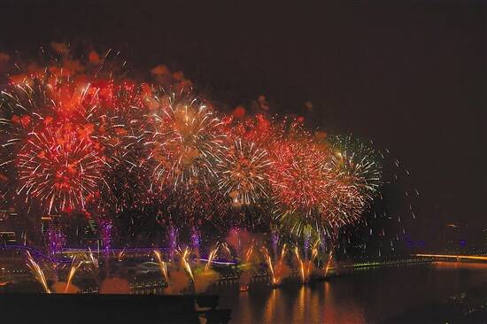 珠海国庆焰火晚会在拱北湾绚丽上演 羊城晚报记者 汤铭明 摄 |