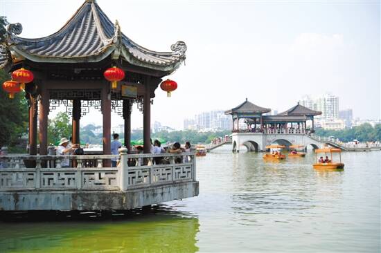 10月2日,惠州西湖景区披红挂彩,迎来万千游人 羊城晚报记者 周巍 摄 |
