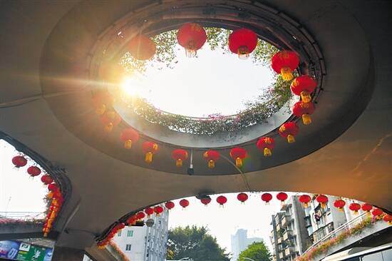 10月2日中山处处洋溢着浓厚的节日氛围,天桥也装扮一新 羊城晚报记者 汤铭明 摄 |