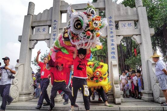 10月3日,佛山南海西樵松塘村,喜庆舞狮 羊城晚报记者 黄巍俊 摄 |