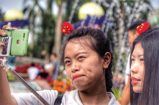 10月3日,广州云台花园,游客头戴国旗发饰 羊城晚报记者 黄巍俊 摄 |