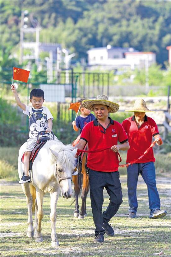 4日,国庆假期乡村游持续升温,广州增城区派潭镇吾乡石屋民宿洋溢着喜庆祥和的节日气氛,小朋友骑着马乐在其中 羊城晚报记者 宋金峪 摄 |