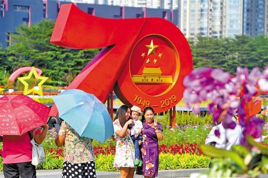 今年是新中国成立70周年,游客在海心沙带有70周年标志的花卉展品前合影留念 羊城晚报记者 汤铭明 摄 |