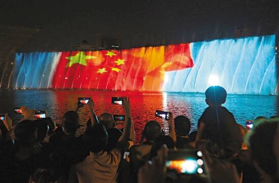 “光影述说 大美东莞”音乐光影喷泉,国庆期间每晚在东莞中心广场精彩上演 羊城晚报记者 王俊伟 摄 |