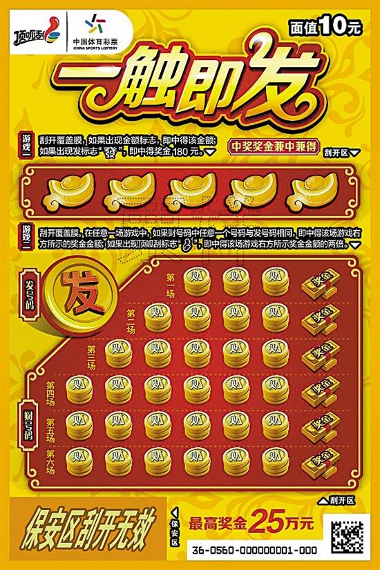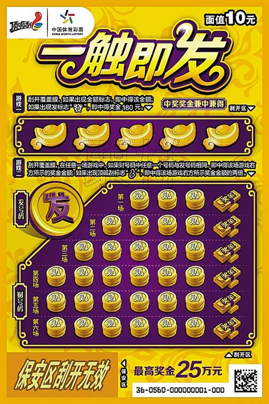 羊城晚报记者从国家体彩中心获悉,财富类即开型体育彩票“一触即发”已经陆续在全国各地闪亮登场。该票一套两张,单票面值10元,头奖25万元。 主题名称寓意着好运触手可及 本次发行的顶呱刮新票“一触即发”主题名称寓意着好运触手可及。在玩法上,采用“找奖金符号”加“数字匹配”的组合玩法,玩法更加丰富。此外,更值得一提的是,在同面值产品中,“一触即发”的中等奖较为丰富。 在票面设计上,“一触即发”色彩搭配靓丽,紫色尊贵、红色经典,十分精美。同时覆盖符号设计巧妙,如游戏二中的发号码与财号码进行匹配,匹配成功就“发财”的概念,与财富类主题颇为契合。 “一触即发”具体游戏规则 游戏一:刮开覆盖膜,如果出现金额标志,即中得该金额;如果出现标志“发”,即中得奖金180元。 游戏二:刮开覆盖膜,在任意一场游戏中,如果财号码中任意一个号码与发号码相同,即中得该场游戏右方所示的奖金金额;如果出现顶呱刮的标志符号,即中得该场游戏右方所示奖金金额的两倍。中奖奖金兼中兼得。 “晚晚好彩”提醒广大即开彩的爱好者,购彩者每购买一张面值10元的“一触即发”,就有2元成为体彩公益金。体彩公益金广泛用于包括补充社会保障基金、医疗、助学、扶贫、残疾人事业、法律援助、全民健身等公益事业。购彩者每购买一张顶呱刮彩票,就完成了一次随手做公益的善举。