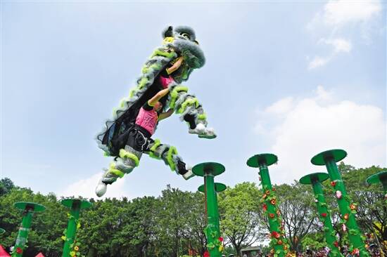 高空跳跃的高桩狮 羊城晚报记者 邓勃摄