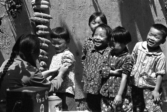 1974年,河南商水县练集公社刘楼大队赤脚医生对农村儿童进行疾病预防工作 新华社发 |