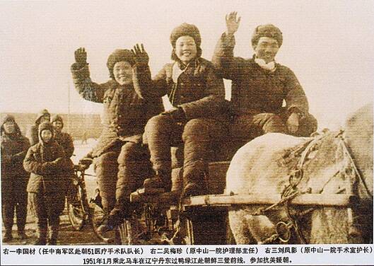 传家宝 90岁的吴梅珍曾是中山大学医学院附属医院的护士,家里珍藏着许多珍贵老照片。她最“宝贝”的是一张摄于1951年1月的照片。照片记录了她和同伴们搭乘马车在辽宁丹东过鸭绿江赴朝鲜参加抗美援朝的情景(见下图)。那一年她22岁。 “我们是全国第一批民间医疗队。”吴梅珍回忆,当时中山大学医学院附属医院有15人报名组成了一支医疗队,抵达朝鲜当晚,他们立即上岗。“大部分是冻伤后干性坏死的截肢手术。不少战士的脚被冻成黑色,像干枯的树枝,我们把冰刮掉,打点麻药就做手术,连破伤风针都没有。”吴梅珍说。 艰苦卓绝的战地医疗经历结束后,吴梅珍回到广州,继续在中山一院工作,直至退休。“我是从农村逃难出来的,成为一名护士,有能力救人,我很自豪。”吴梅珍说,“我这一辈子,哪里都不去,就待在中国。” 羊城晚报记者 丰西西 通讯员 彭福祥 刘星亮 梁嘉韵