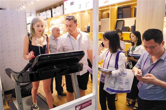 参展商在参观了解智能跑步机的情况 羊城晚报记者 宋金峪 摄 |