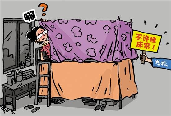 漫话漫画 文/大汗 图/春鸣 10月14日,有网友微博发文称,江苏第二师范学院石湫校区宿舍不许学生挂床帘、贴挂钩等,引发关注。新京报记者从江苏第二师范学院石湫校区学工处获悉,学校确有该项规定,不许学生挂床帘是出于安全考虑。(10月15日新京报) 挂床帘竟然会影响到学生的安全?这不是脑洞大开,且听学校的解释——“因为床帘会把学生隔离在一个个封闭空间里,如果学生发生意外,很难会被发现,之前就发生过类似事情。”毕竟,床帘低垂,外面难以窥探内里的乾坤,硬是掀开,于情于礼于理皆为不合,故而,学校推出这一规定。 床帘的重要性对每个人来说恐怕不一,由于宿舍的学生来自不同的家庭,各有不同的生活习惯,有人爱早睡,有人易失眠,有人会打呼噜,有人偏喜裸睡……小小床帘一隔,便成两处天地,相互虽共处一室,各人亦有一方小小的空间。 学生有保护隐私的自由,学校亦有拆床帘的理由,双方如何各得其所,其实并不是非拆帘不可,对于那些不愿拆帘的同学,在帘内装个平安钟之类的东西亦是可以考虑的范畴。